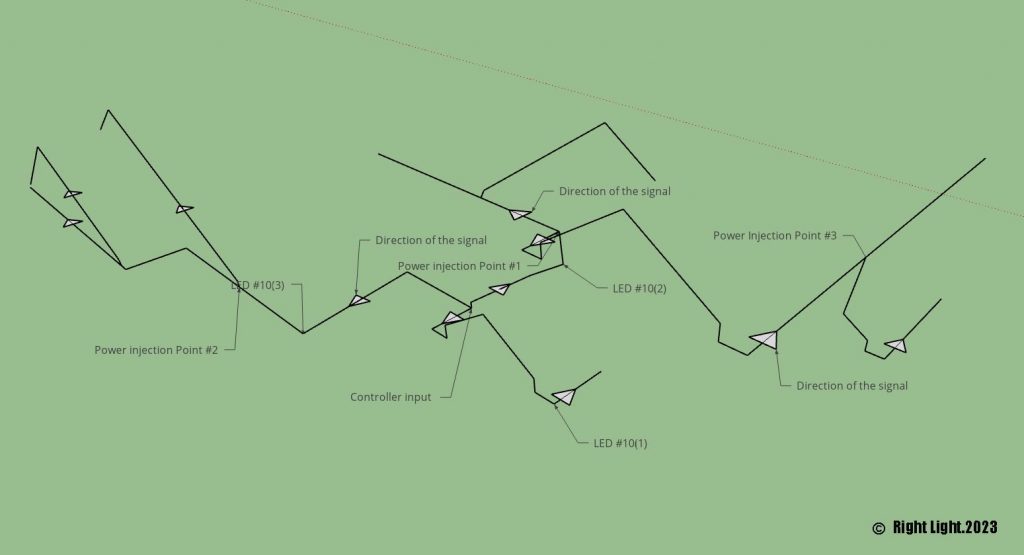 In the example picture, there are three parallel lines coming from the controller. This means that all LEDs on these lines with the same address will execute the same command at the same time. The simple idea of an address is the number of LEDs between a given LED and the controller.